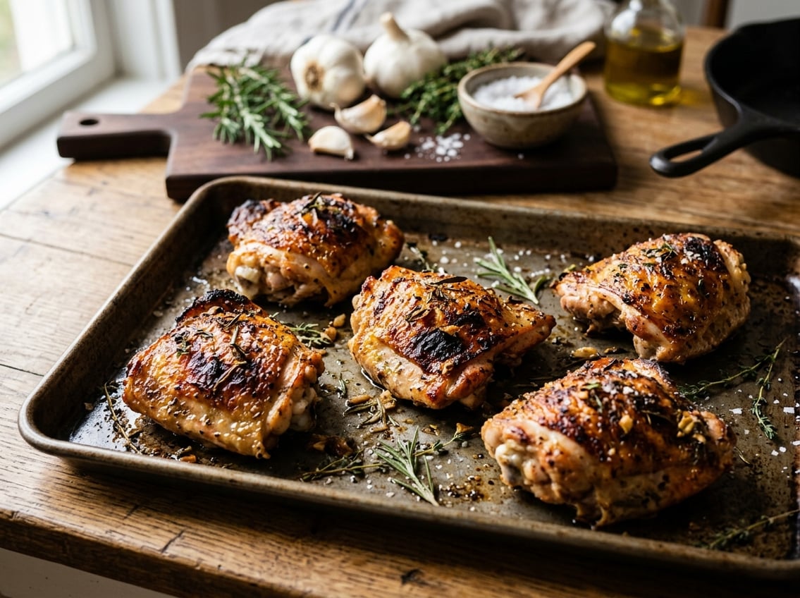 Before sliding the pan into a preheated oven, give the thighs a final pat to remove any condensation. This improves contact between skin and hot surface for crispier results.