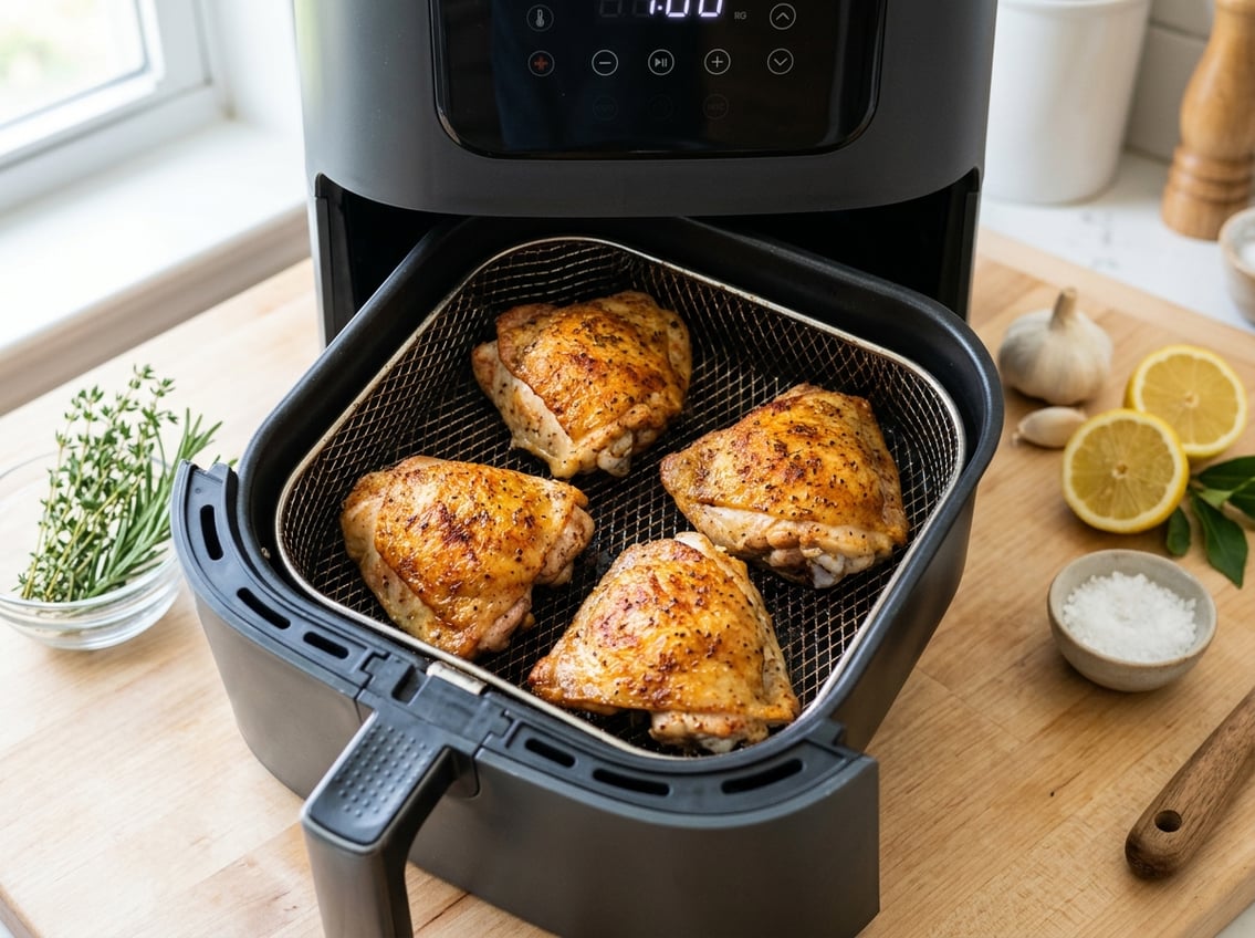 For bundled boneless thighs, cook 10 minutes, flip, then 5–7 more minutes. Don’t overcrowd the basket—leave half an inch of air around each piece for even circulation.
