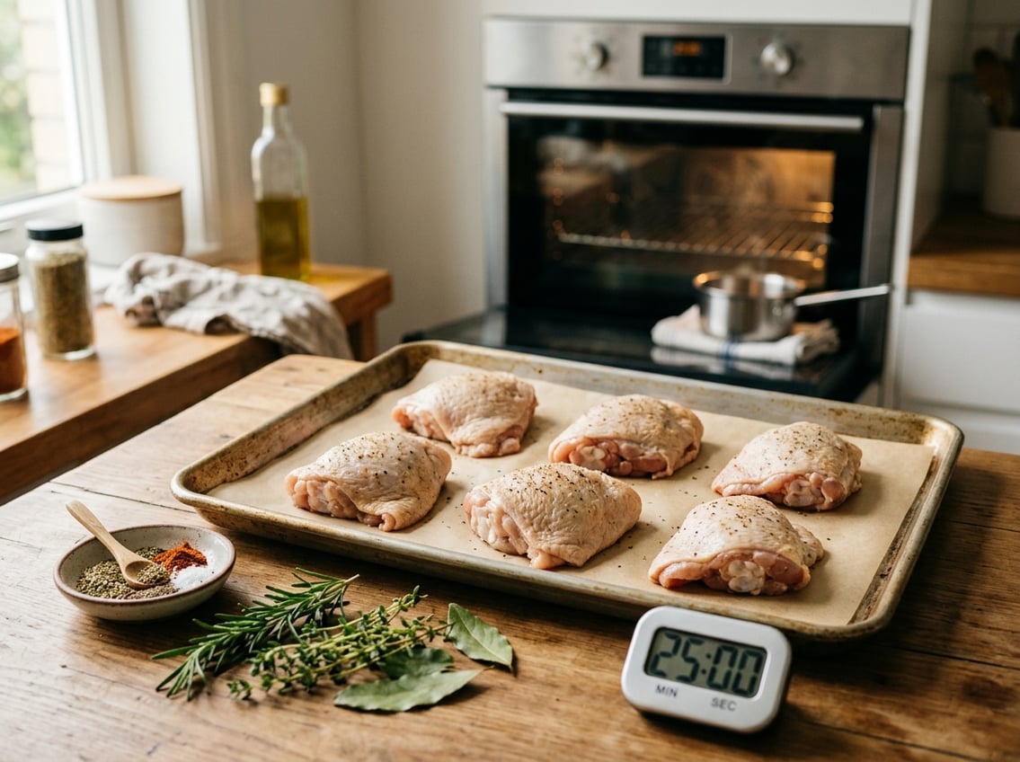 If you bake at high heat (400–425°F / 200–220°C), preheat the oven and let thighs sit at room temperature 15–20 minutes before baking. For bone-in thighs, place thicker pieces toward the center of the pan.