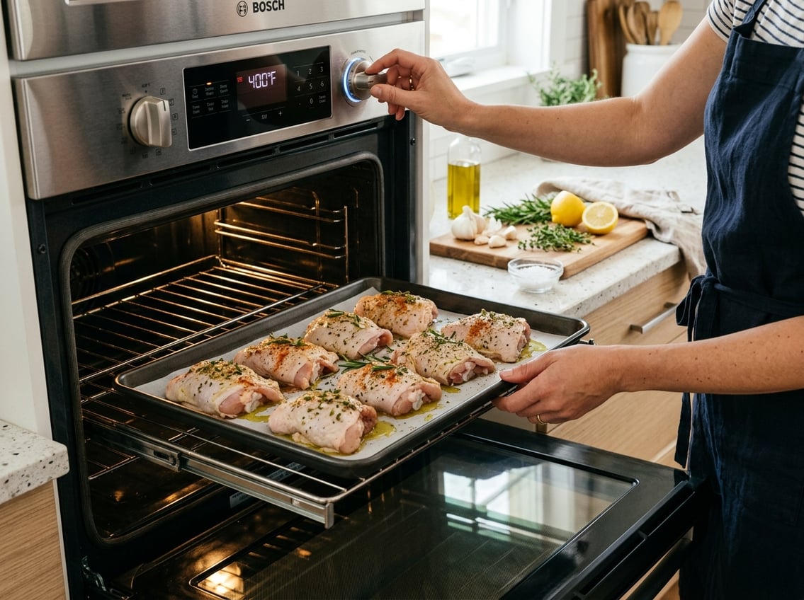 Preheat the oven to the target temperature: 400–425°F (200–220°C) for skin that crisps while staying juicy, or 350–375°F (175–190°C) for gentler cooking.