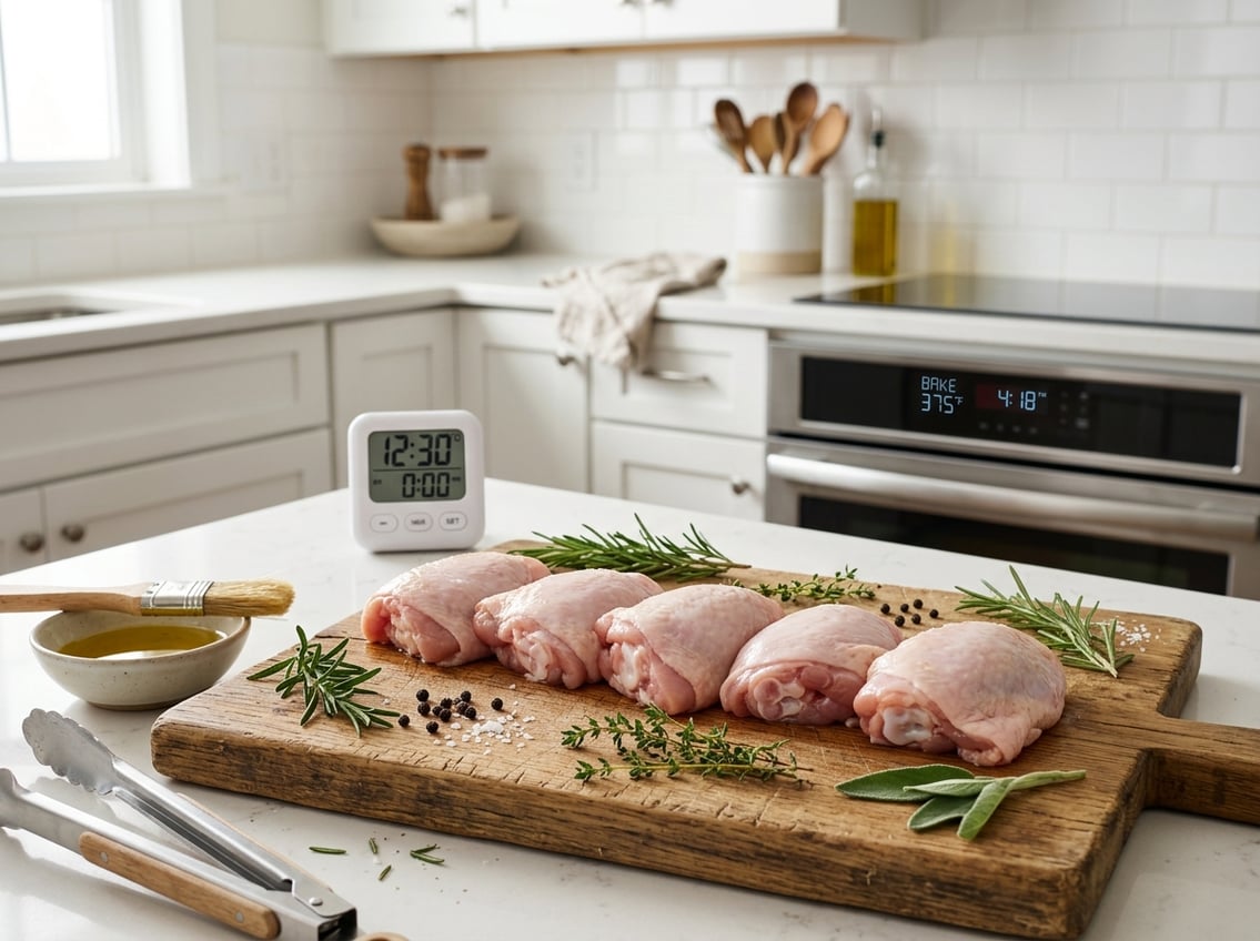 Start by removing excess moisture and choosing a seasoning or wet flavor base that matches your cooking time and oven temperature. Arrange thighs so heat circulates and skin can crisp.