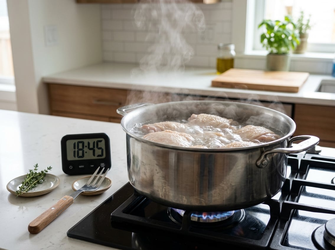 Boneless chicken thighs usually take about 10–12 minutes in gently simmering water. Bone-in thighs need roughly 15–18 minutes to reach a safe internal temperature.