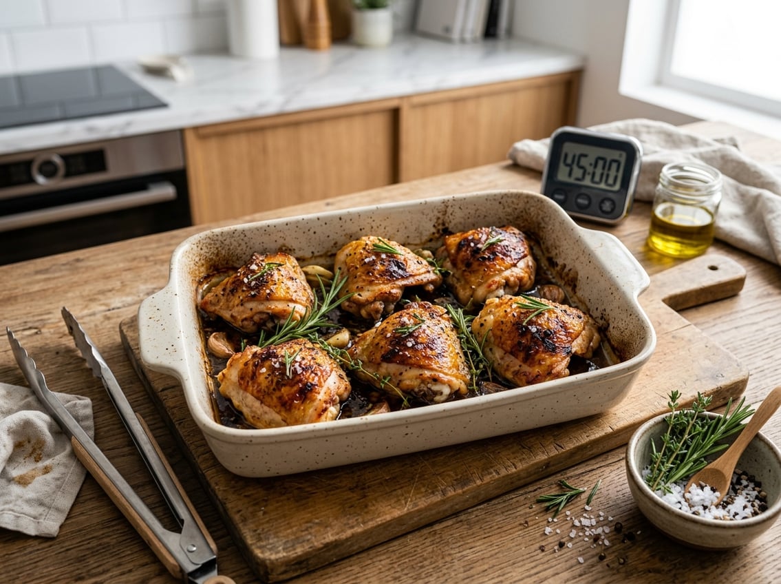 If you want crispier skin, finish under a broiler for 1–3 minutes after baking. Let thighs rest 5 minutes off heat so juices redistribute.