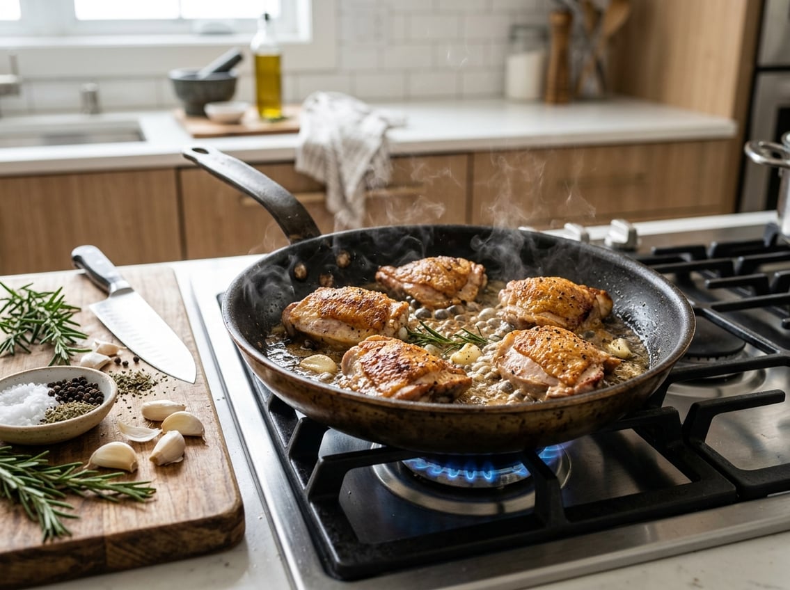 Learn techniques for searing, finishing under a lid, and checking doneness so your chicken thighs come out juicy every time.