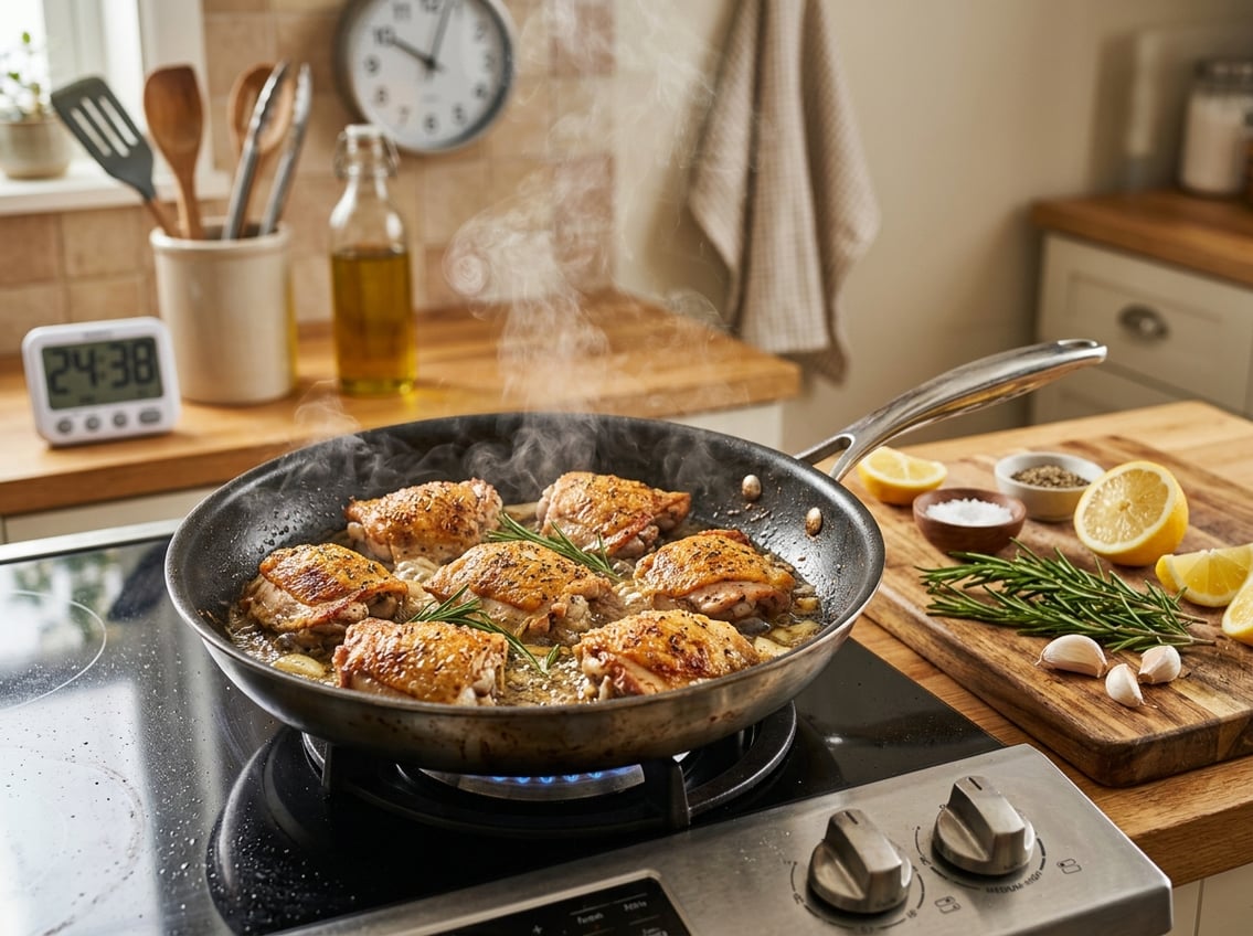 Pan-roasting gives brown, crispy skin with a short stovetop sear and oven finish. Pat skin-on thighs dry, season, then sear skin-side down in a hot oven-safe skillet for 6–8 minutes until golden and rendered.