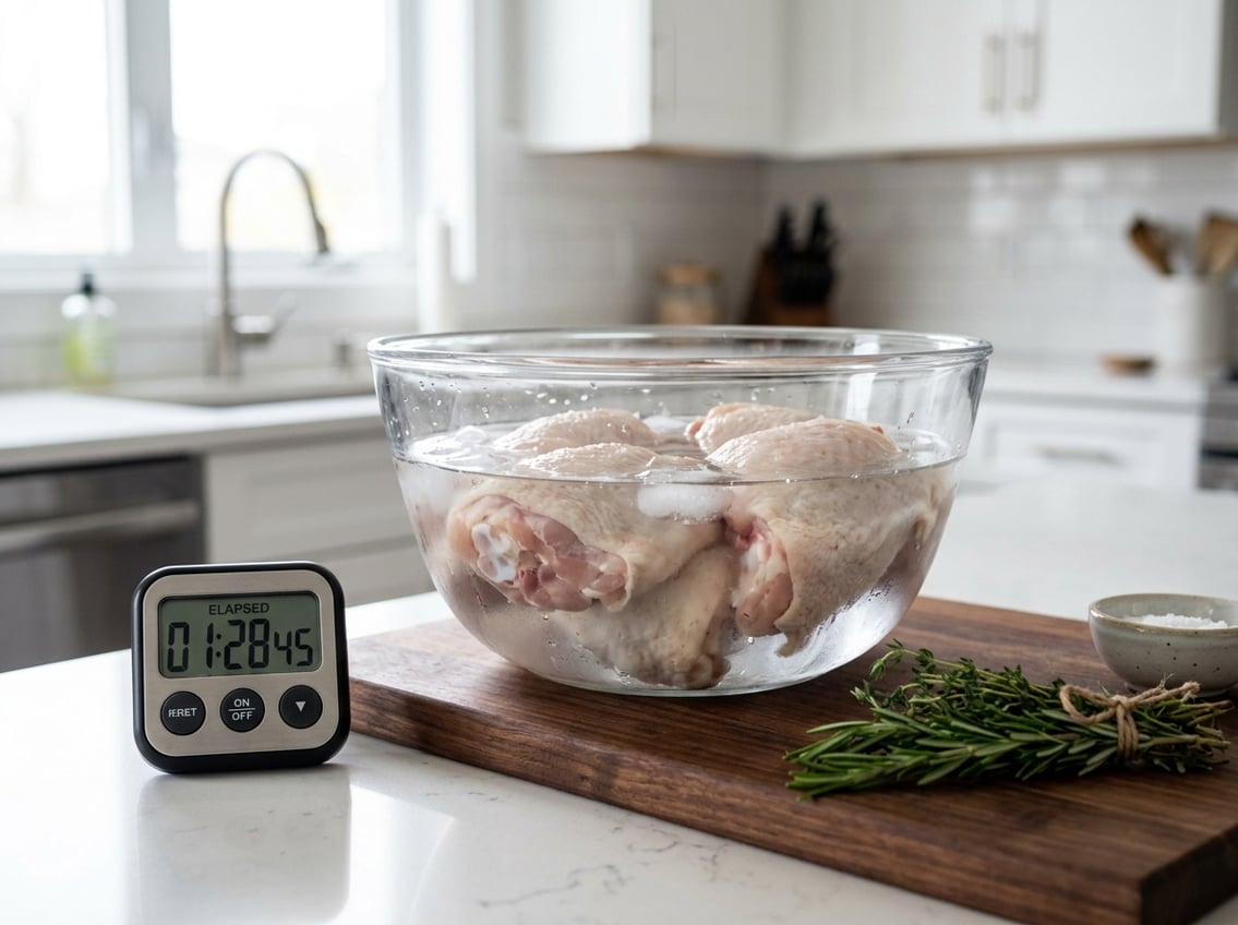 Cold water thawing gets frozen chicken thighs fully thawed in about 45 minutes to 2 hours, depending on package size and thickness. Keep the chicken sealed, use cold tap water, and change the water regularly to keep thawing steady.