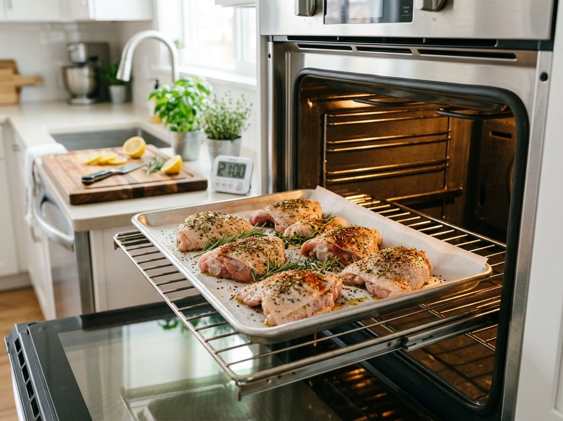 Set the oven based on your texture goals. At 425°F (220°C), boneless thighs cook in about 20–30 minutes and develop a crisp exterior.