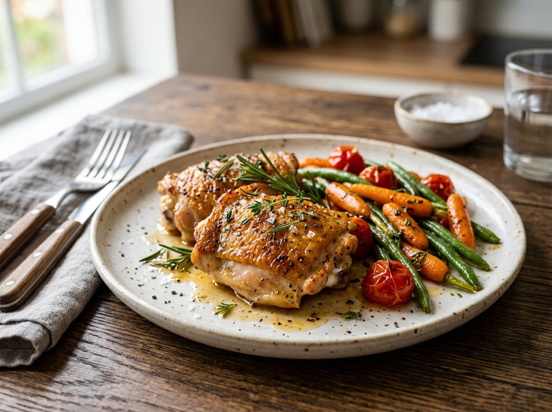 If you want to trim calories further, remove the skin or serve smaller thigh portions alongside high-fiber vegetables and whole grains to stretch the meal without sacrificing fullness.