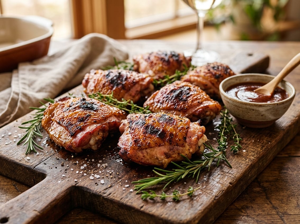 Place thighs skin-side up during the low phase and flip to skin-side down during the high-heat finish if using a direct-heat surface. Apply sauce only in the final 5–10 minutes to avoid burning sugars.