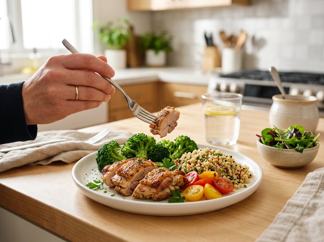 Plan meals around 3–4 ounce cooked portions of thigh paired with 1–1.5 cups of vegetables and a measured grain or legume serving.