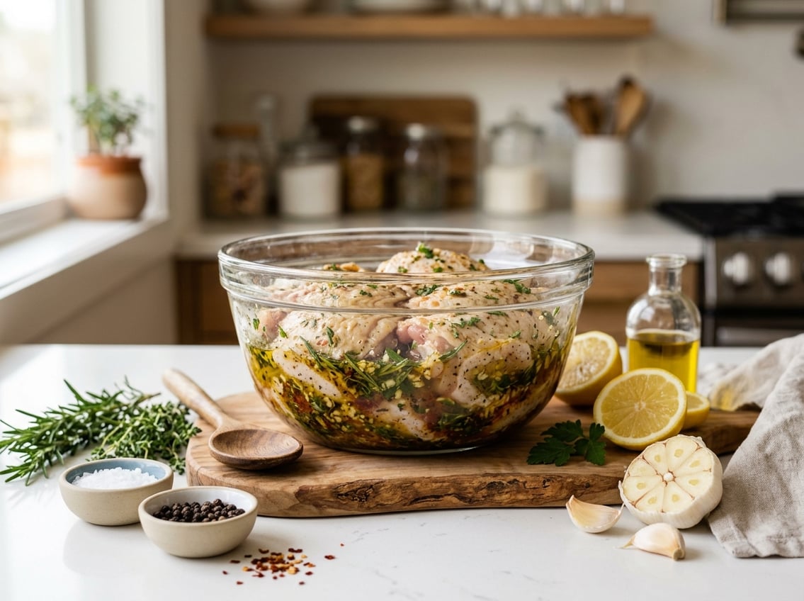 Chicken thighs contain more connective tissue and fat than breasts, so they tolerate longer marinating without turning rubbery. A balanced, low-acid or dairy-based marinade can tenderize for 12 to 24 hours while preserving a pleasant texture.