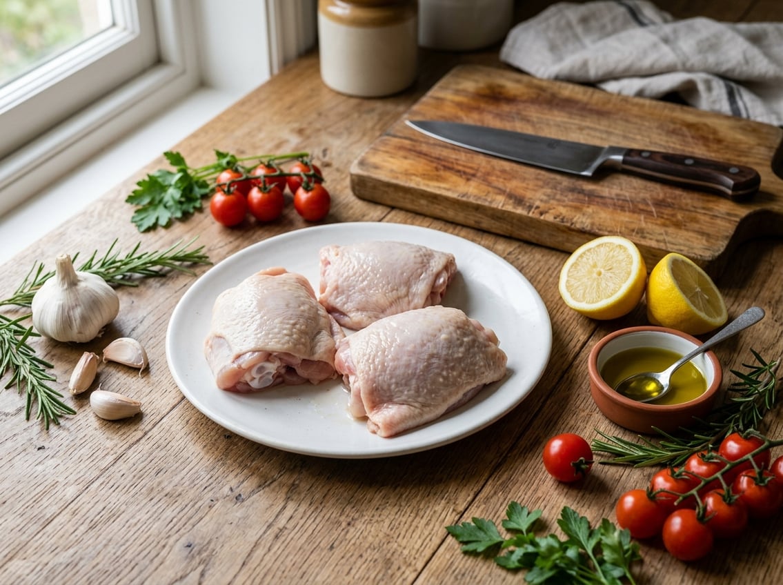 The dish benefits from a splash of red wine or a pinch of capers for brightness. For a French approach, roast thighs with herbes de Provence, garlic, and lemon; serve with roasted potatoes or a simple green salad.