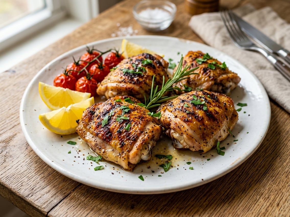 Perfect chicken thighs have golden-brown, crisp skin (when skin-on), opaque meat that flakes easily, clear juices, and an internal temperature of 165°F (74°C) in the thickest part. These cues show the thigh is cooked through and still juicy.