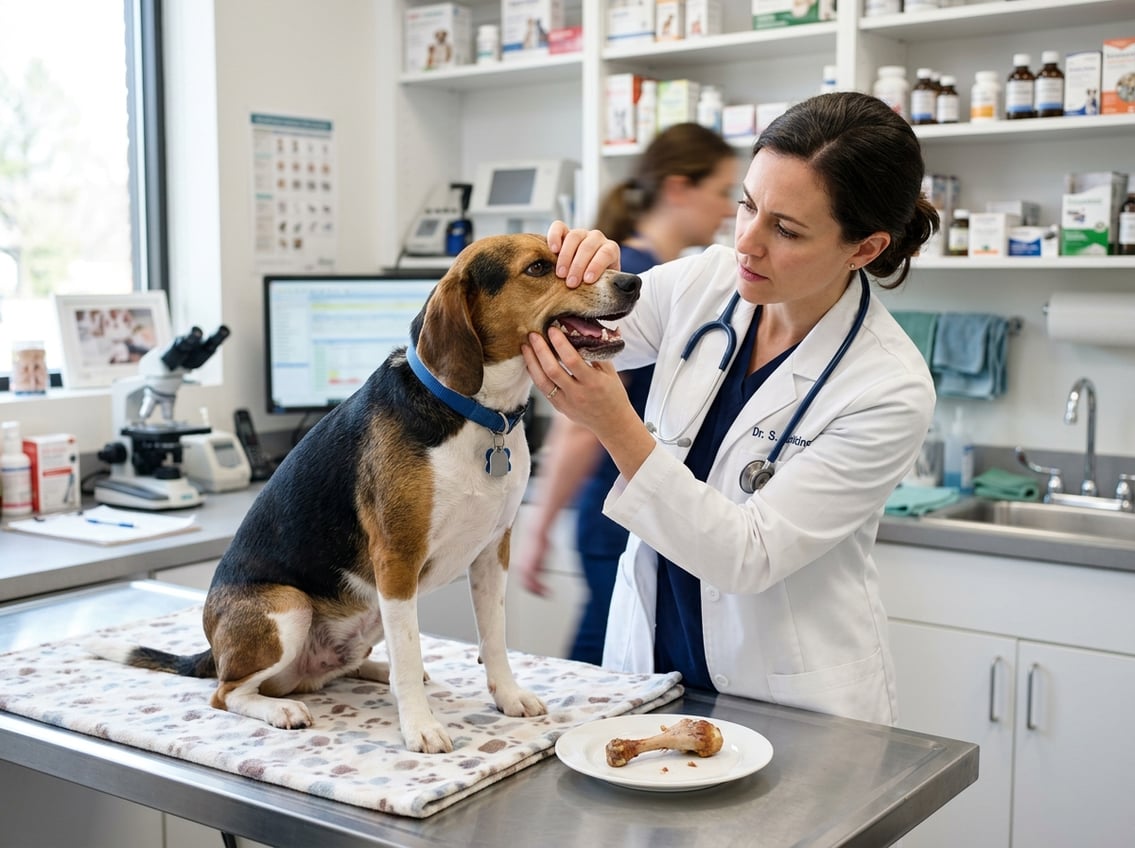 Your vet begins with a focused physical exam. They check airway patency, mouth and throat for lodged fragments, abdominal palpation for pain or masses, and temperature for fever.