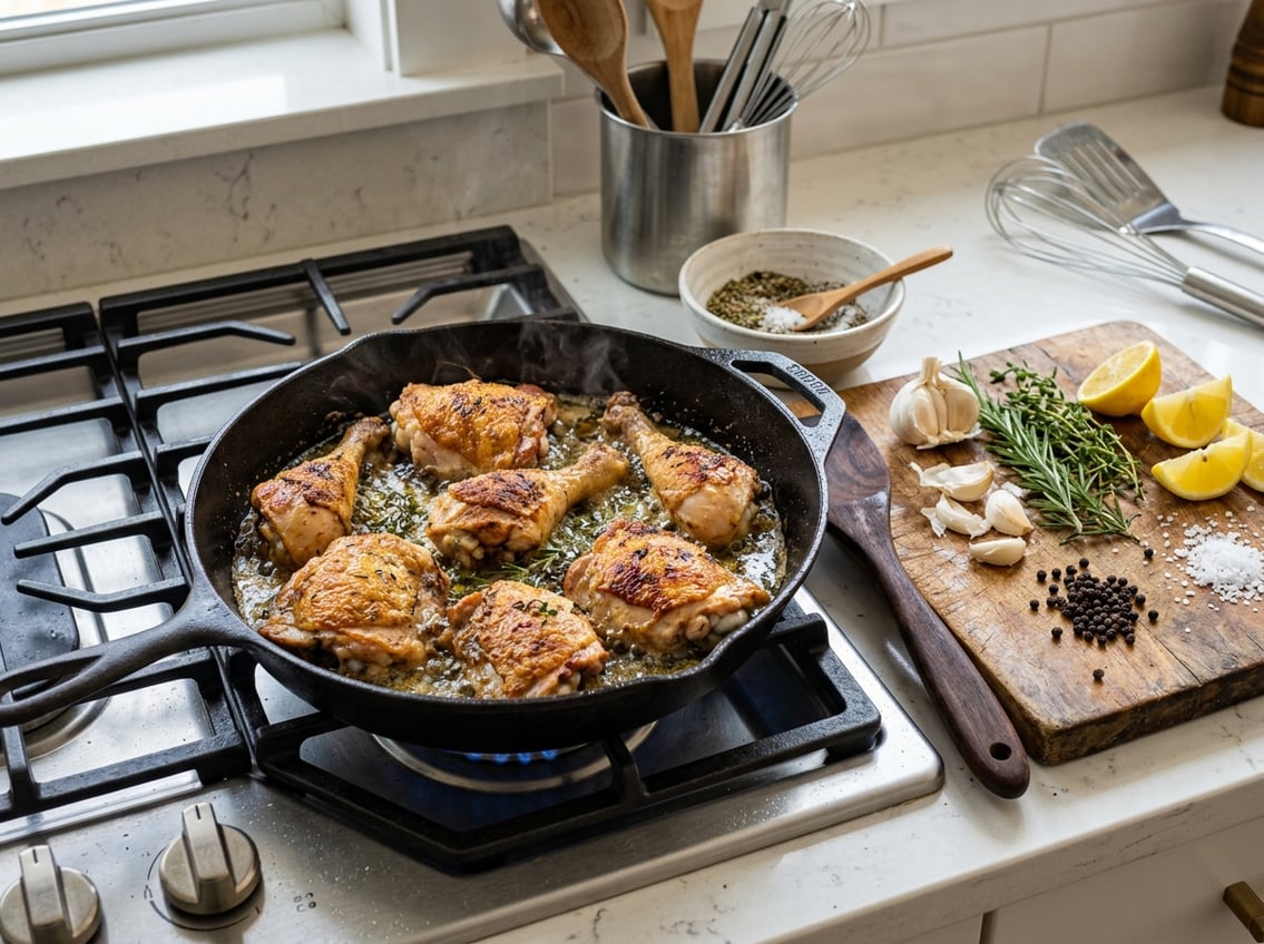 You want juicy, tender meat with crisp, flavorful skin. The easiest way to get that is to pan-sear bone-in, skin-on thighs or drumsticks and finish them in the oven for even cooking and consistent results.
