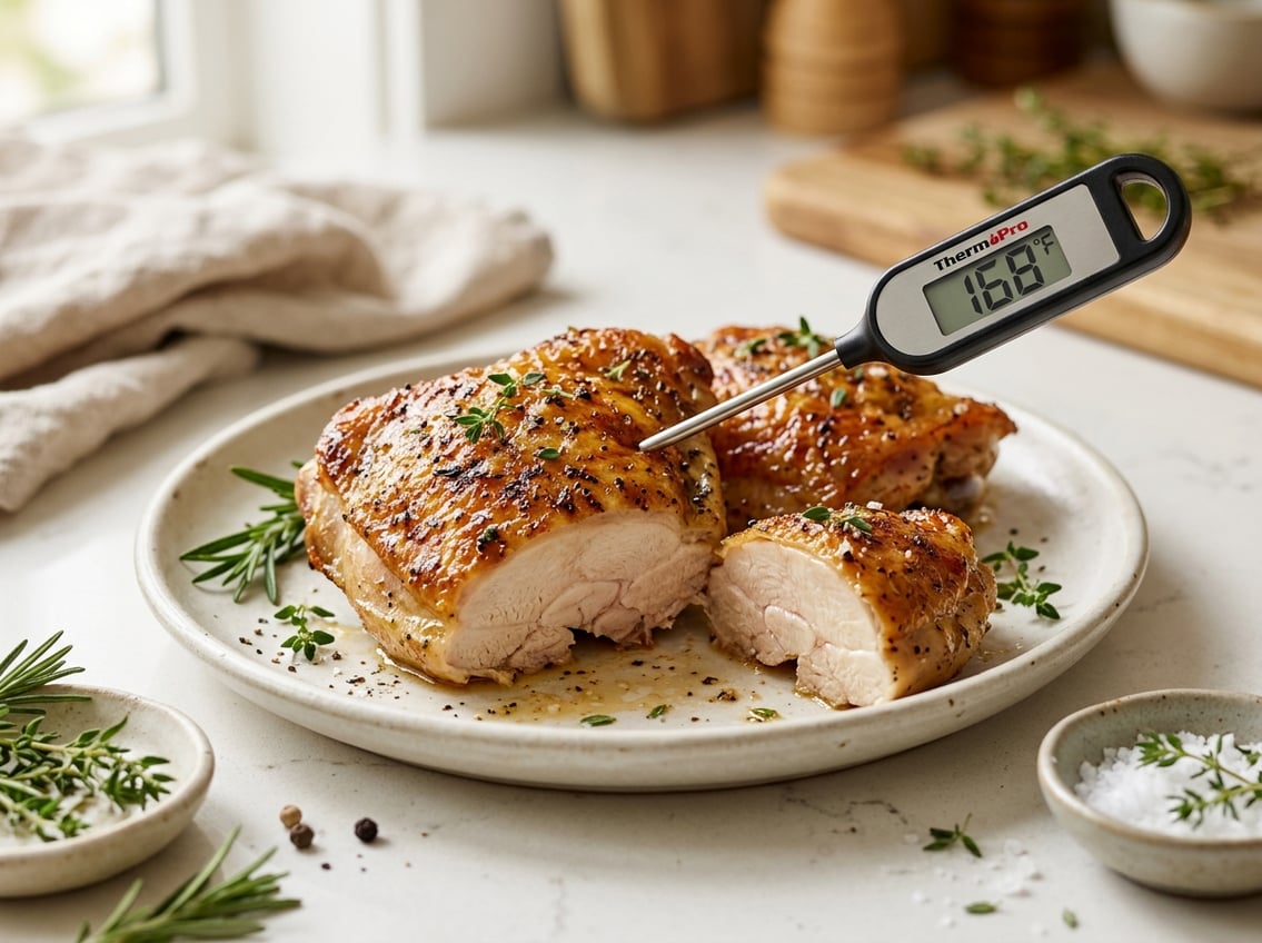 For bone-in thighs, check several spots near the bone because heat distribution varies. If you prefer target doneness at 170–175°F, use the thermometer to hit those specific numbers rather than guessing by color or juices.