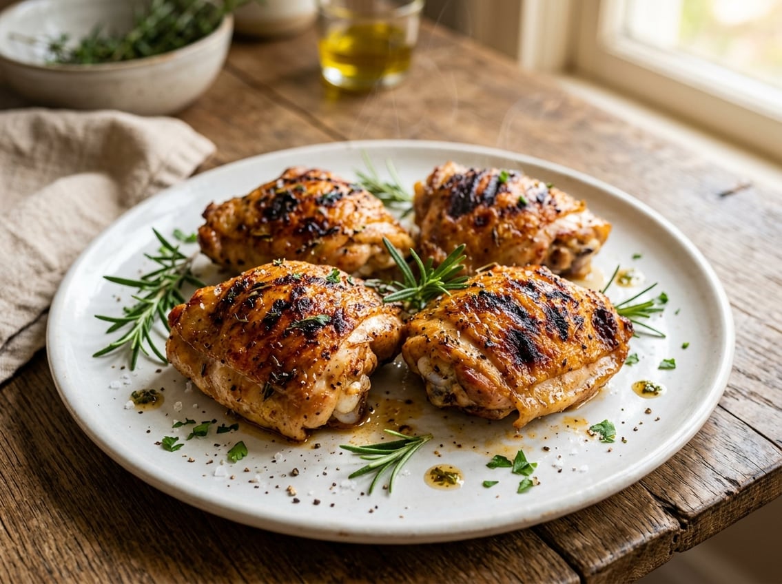 For boneless thighs, sear over medium-high heat to develop crust, then finish at lower heat or in the oven until internal temp hits 165–170°F (74–77°C).