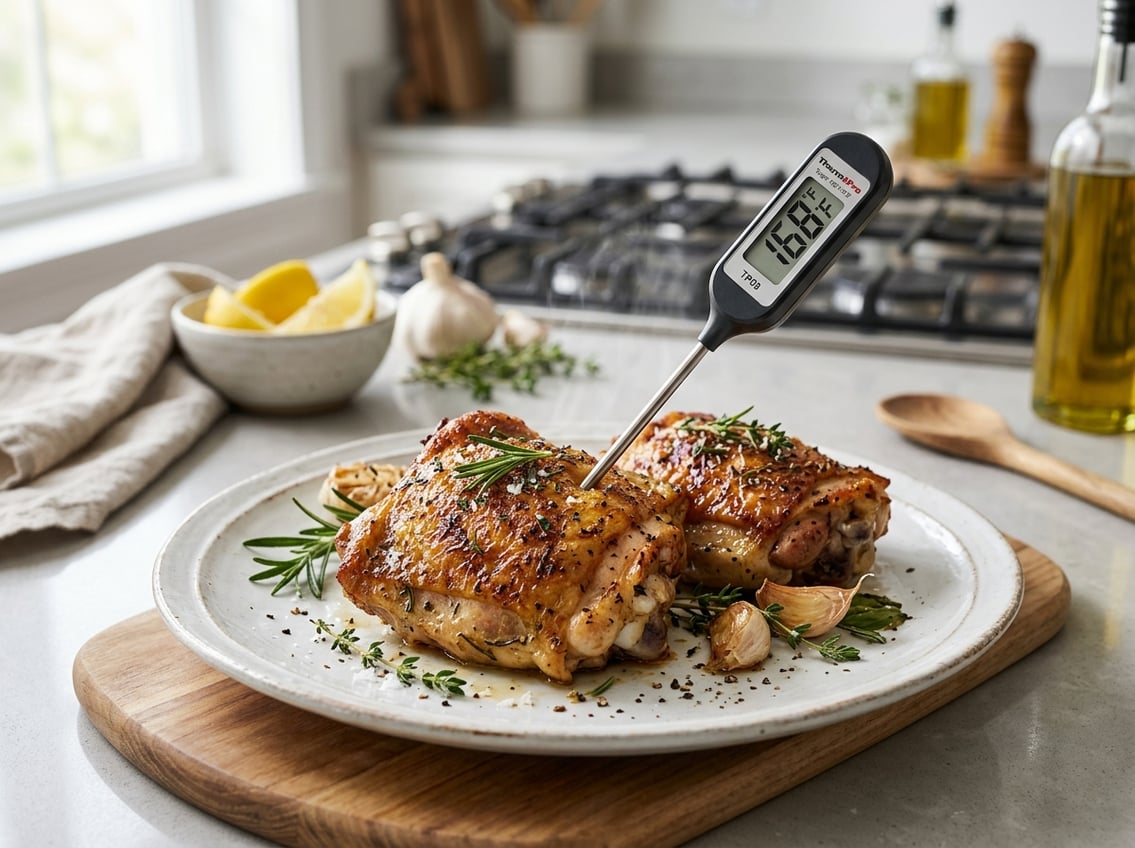 Use a reliable instant-read thermometer in the thickest part of the thigh, avoiding bone, and let the meat rest for a few minutes so the temperature evens out. This guide covers key temperatures, how to measure them, how temperature affects texture, and simple cooking methods for crispy skin and flavor.