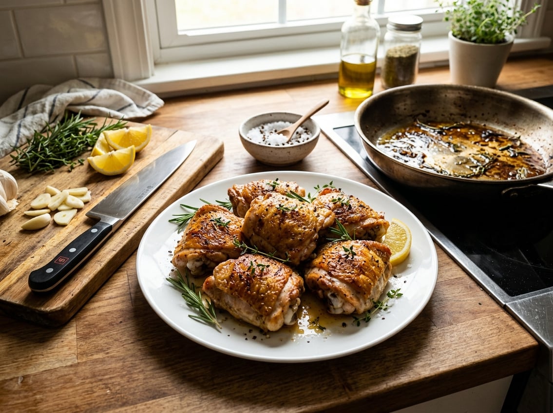 For a simple herb finish, add butter, smashed garlic, and thyme to the pan during the last oven minutes and baste the thighs once.