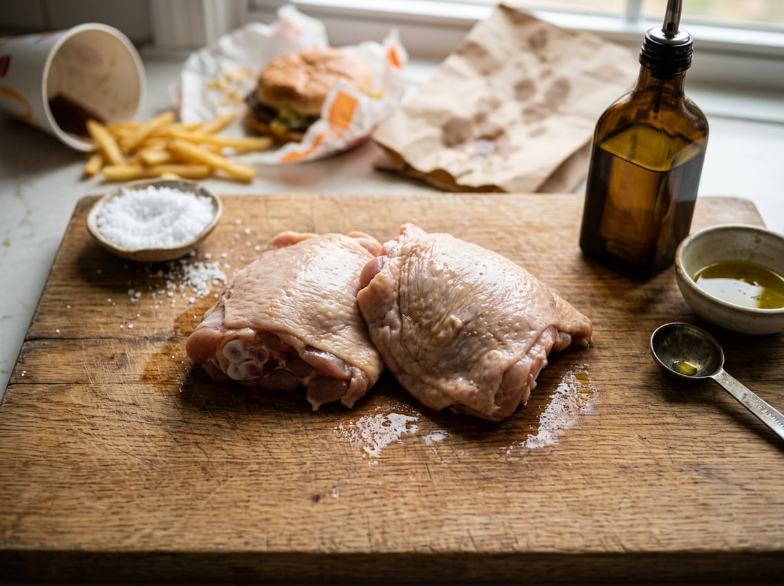 Buy skinless thighs or remove skin before eating. If you prefer skin-on for flavor, roast on a rack and drain fat, or remove skin before serving. Avoid deep-frying skin-on thighs to prevent a large increase in added fats and calories.