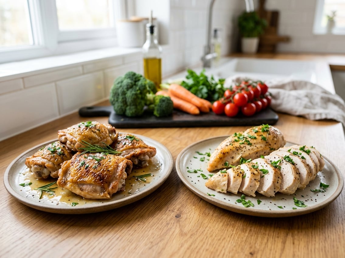Choose thighs when you want higher iron, zinc, and culinary juiciness. Choose breasts when you need lower calories or lower total fat.