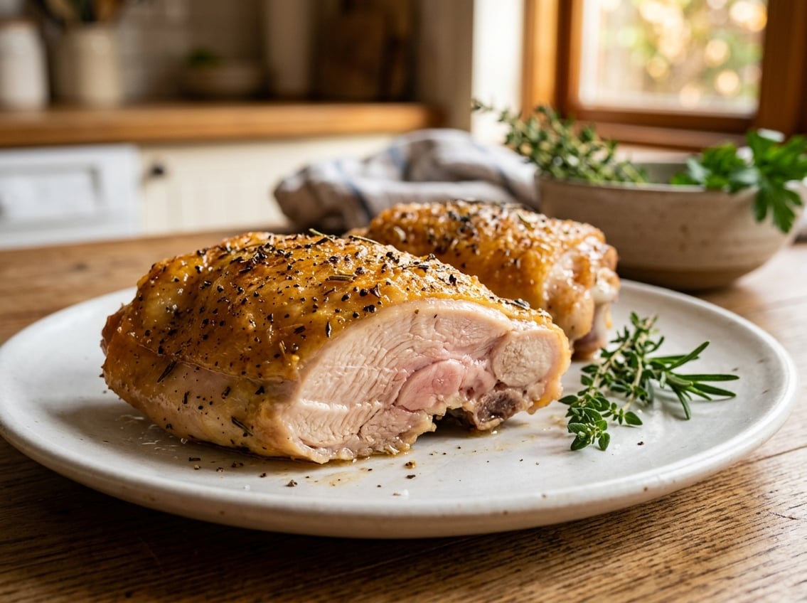 Low-and-slow methods like braising or slow-roasting let connective tissue break down and keep thighs moist. They can still retain a pink tint near the bone.