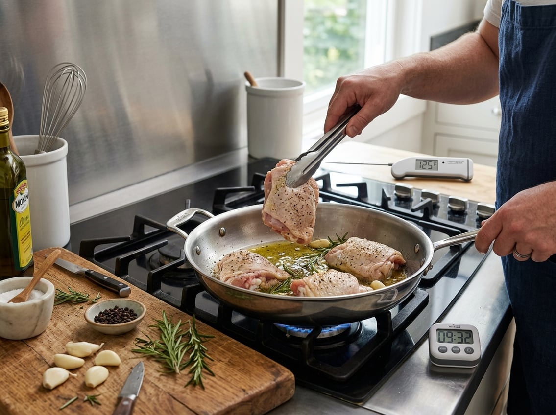 Many cooks sear skin-on thighs first to render fat, then finish at a moderate temperature for tender results.